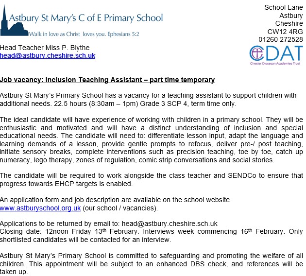 Astbury St Mary’s Primary School is committed to safeguarding and promoting the welfare of all children. All appointments are subject to safer recruitment procedures, will be subject to an enhanced DBS check and references will be taken up.